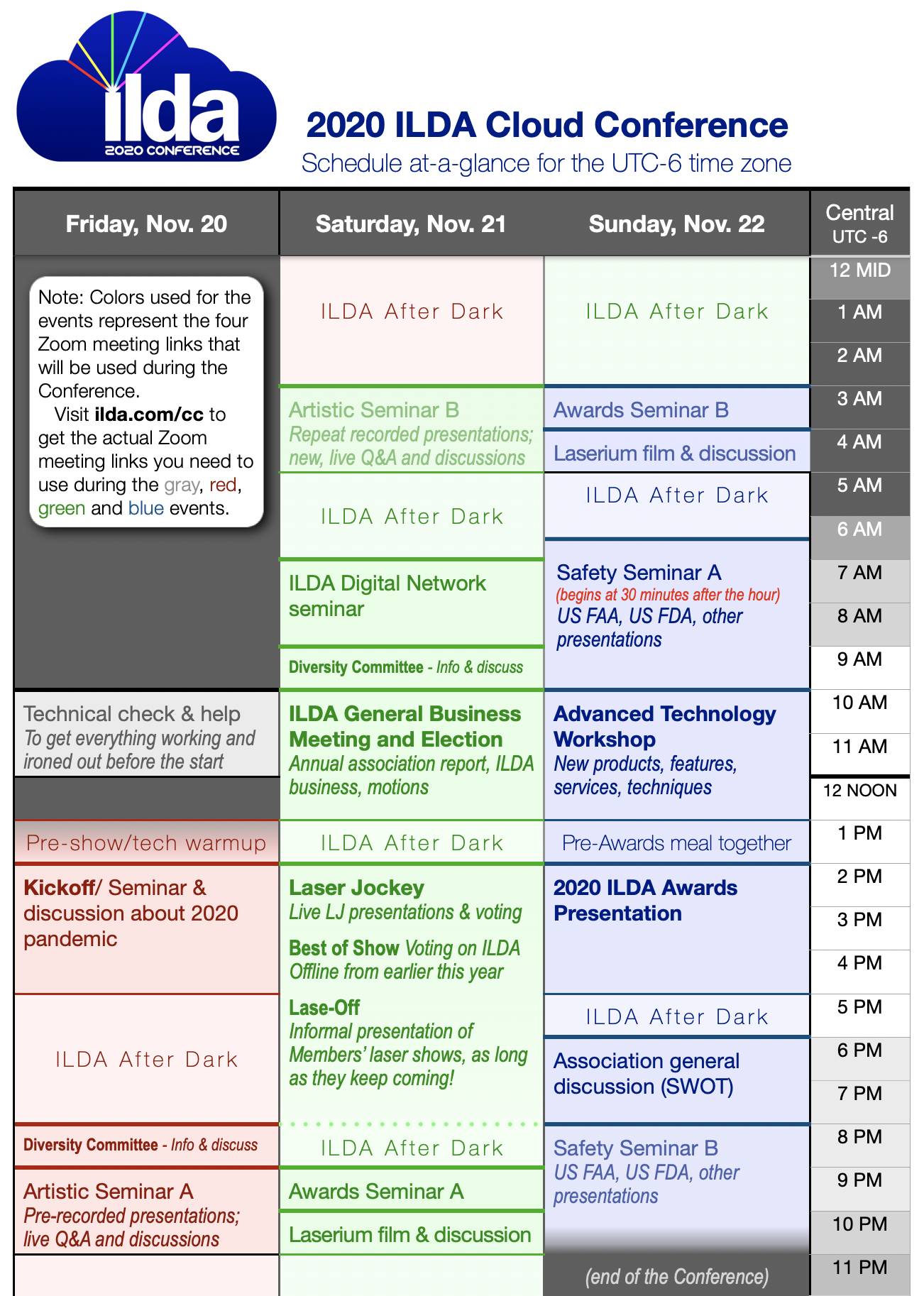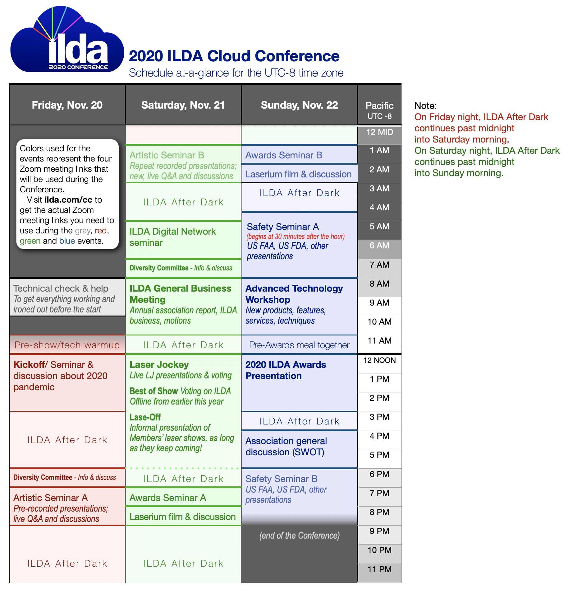The Conference begins with a Kickoff event, followed by a seminar and discussions about the current state of laser shows, what events have worked, and when we might be getting back to normal.