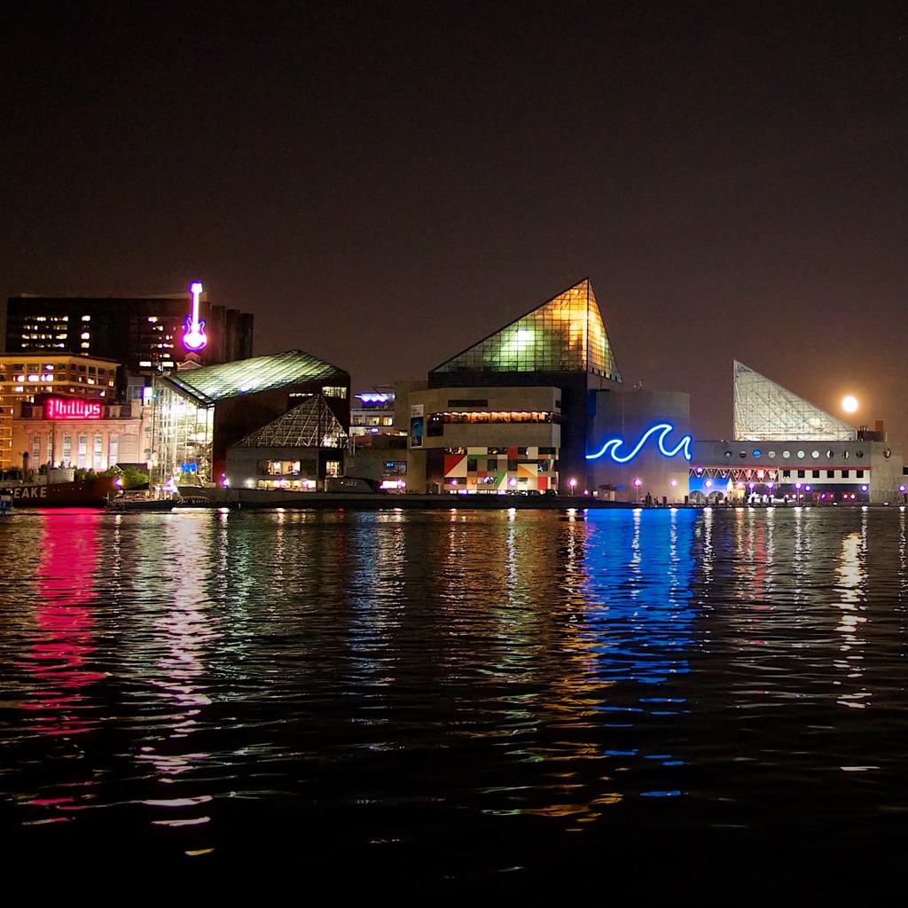 Photo credits: Baltimore Inner Harbor night view by Austin Kirk, via flickr, CC BY 2.0; daytime view by the Royal Sonesta hotel