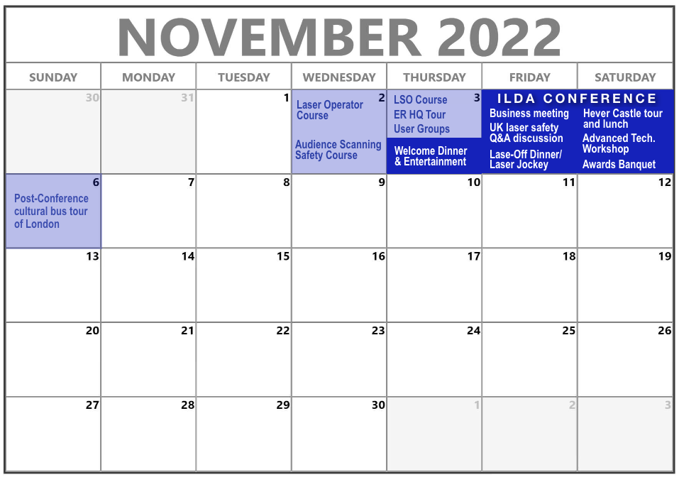 The main Conference dates are Thursday 3 November through Saturday 5 November, 2022. On Wednesday 2 Nov. and Thursday 3 Nov. are laser safety classes. There is an optional post-Conference bus tour of London on Sunday 6 Nov.