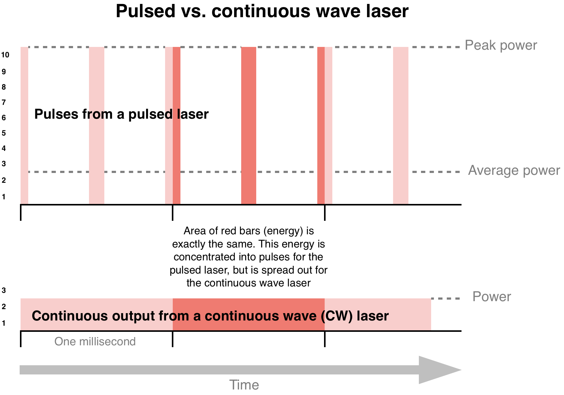 Pulsed lasers are inherently MUCH more dangerous than normal continuous wave lasers. Each pulse carries much more energy than the continuous stream of normal laser light, as shown below.