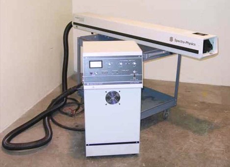 The Spectra-Physics krypton gas laser required massive amounts of power and water to operate. It needed a 220 volt, 3-phase power line and required a wide-open water faucet for cooling water.